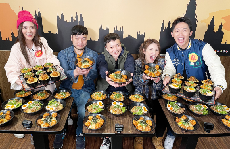 ▲ 大胃王邵阿咩、吃飯兄弟挑戰3公斤九宮格丼飯。(圖:緯來綜合台)