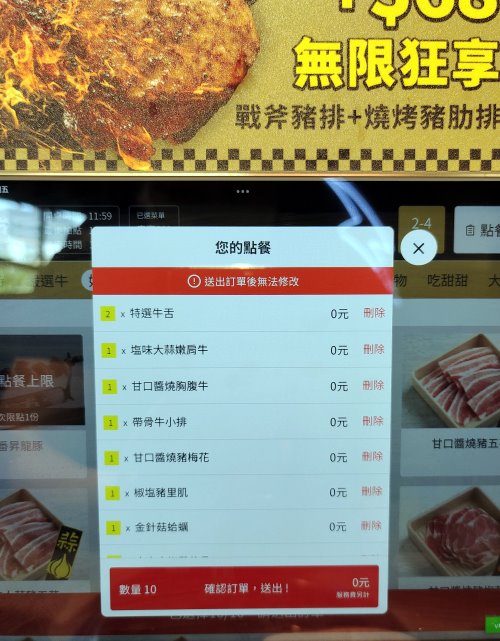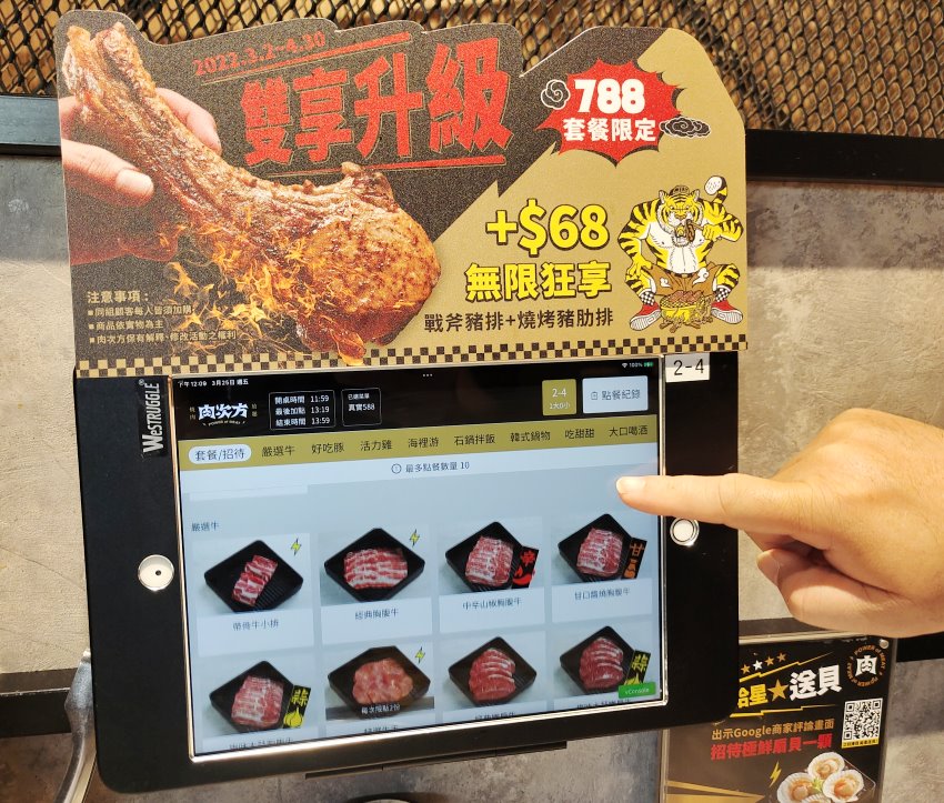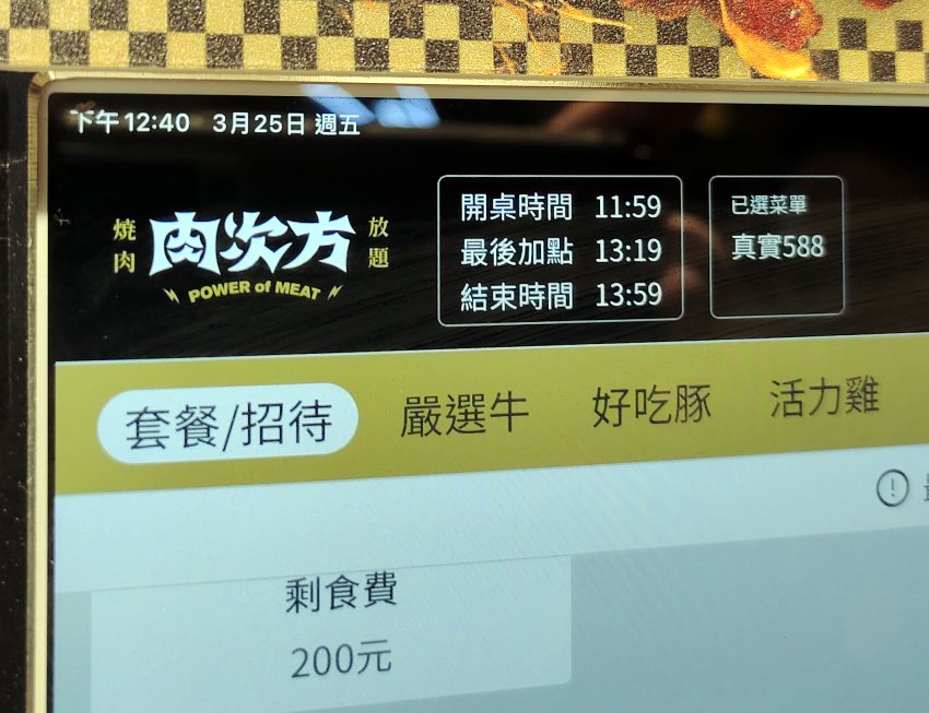 ▼平板上方也會有開桌時間、最後加點時間、結束時間,提醒大家還剩多久可以享用!不過當天我們訂位是12:00,來的時間有稍微延遲10分鐘,但服務人員說還是從11:59開始計時(不知道為什麼不是12:00),所以建議大家不要遲到不然用餐時間會變少喔~~另外加點時間只有80分鐘,最後留40分鐘給大家慢慢烤,跟菜單寫的有點落差,大家要稍微留意一下時間唷!不過也提醒大家量力而為,不要點過多以免浪費,甚至還有可能被加收剩食費喔!