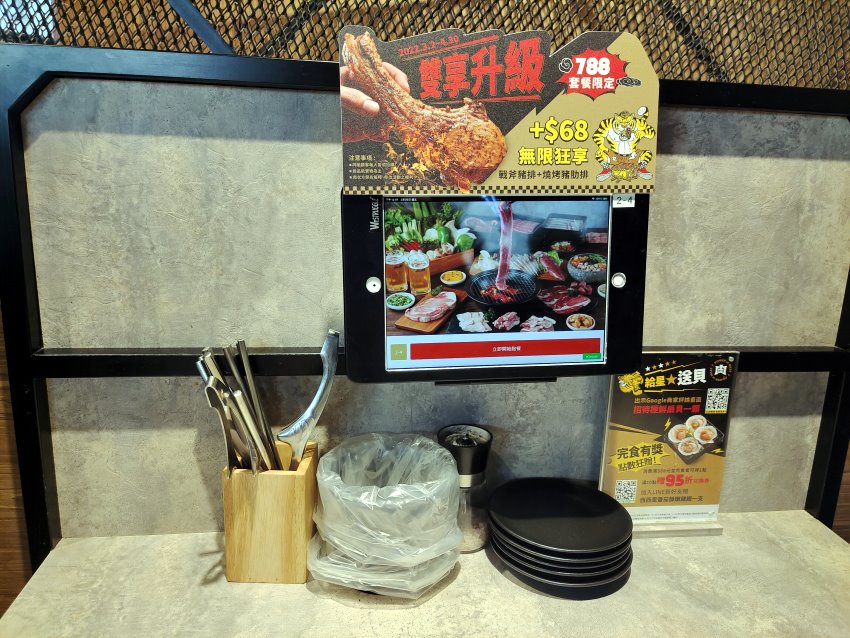 ▼每桌都有平板,想吃什麼直接點;一旁還附有餐具、烤肉夾、垃圾桶、玫瑰鹽、盤子等,有需要的朋友都可以直接拿取使用!