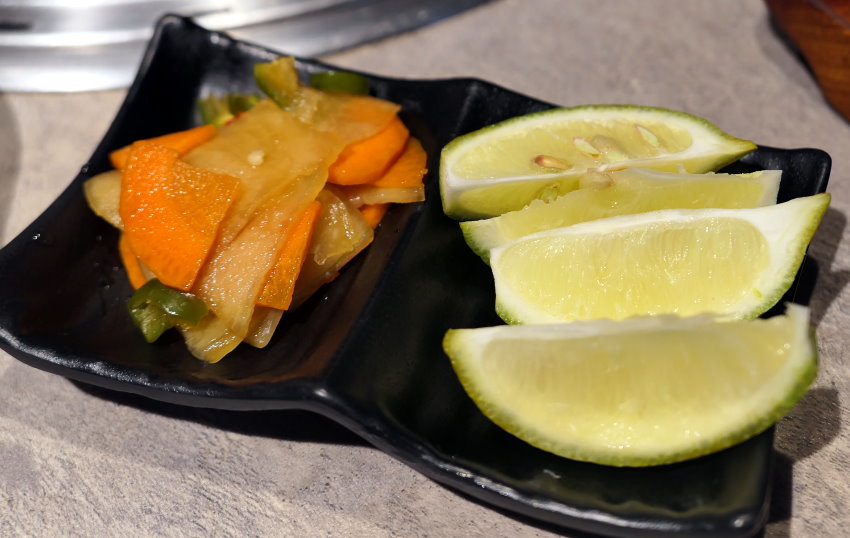 ▼韓式洋蔥醃菜、檸檬角,洋蔥醃菜吃起來爽脆甘甜,開胃又解膩~~檸檬角可以搭配較肥的肉品享用,口感也會更加清爽!
