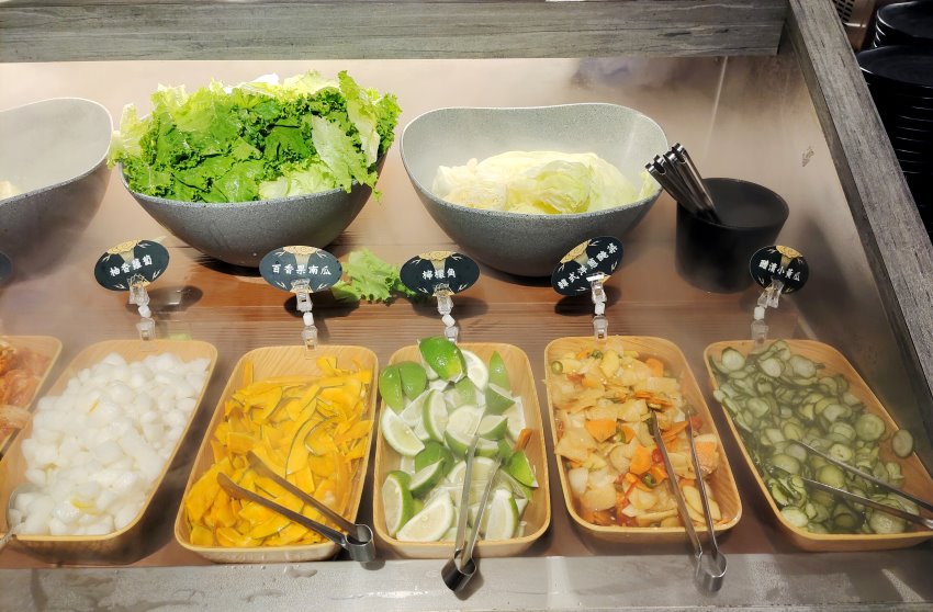 ▼小菜區有蔥鹽、韓式辣蘿蔔、韓式泡菜、百香果南瓜、醋漬小黃瓜、韓式洋蔥醃菜、柚香蘿蔔、檸檬角等,我們通通夾上一輪備用!