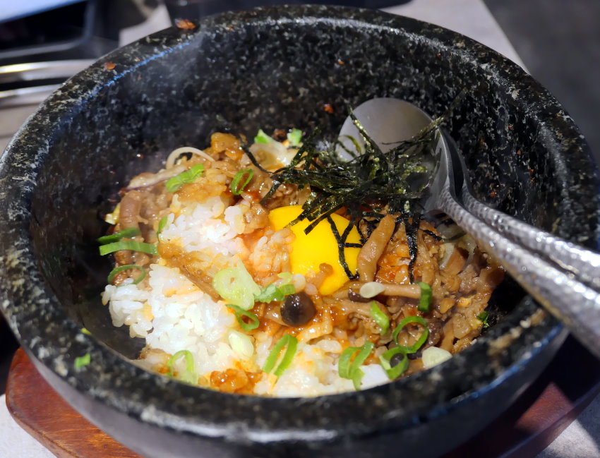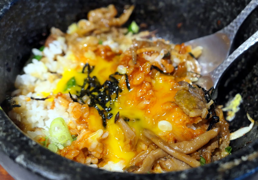 ▼月見牛肉拌飯,剛上桌還在滋滋作響,大家可要趁熱趕快攪拌均勻才好吃!