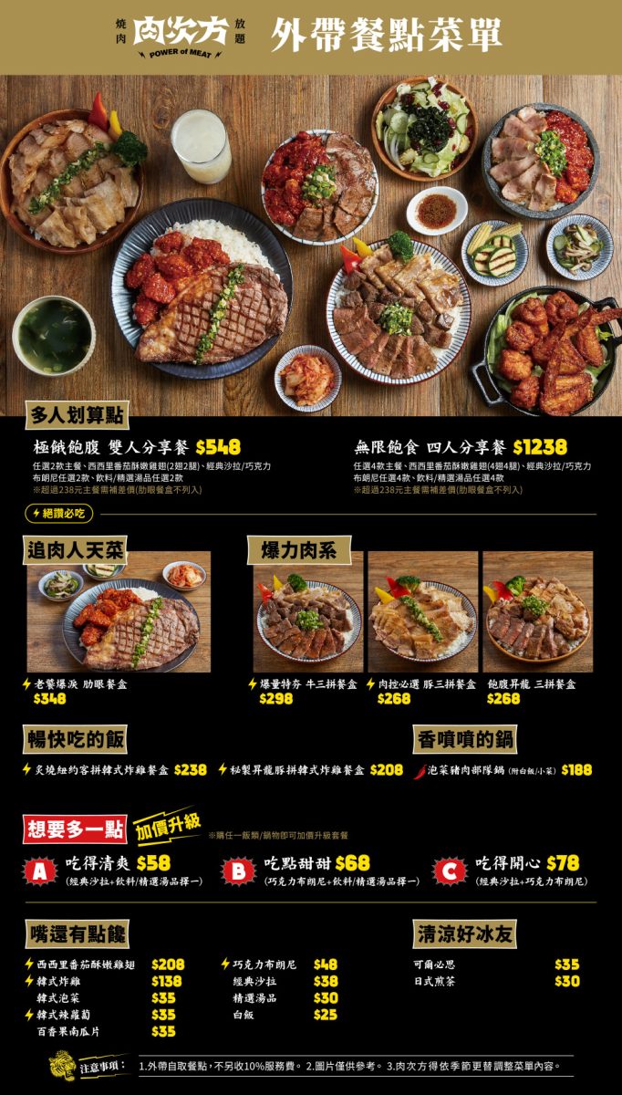 ▼肉次方燒肉放題菜單,提供給大家參考~~除了內用菜單也有外帶菜單,讓你在家也能享受美味的燒肉!
