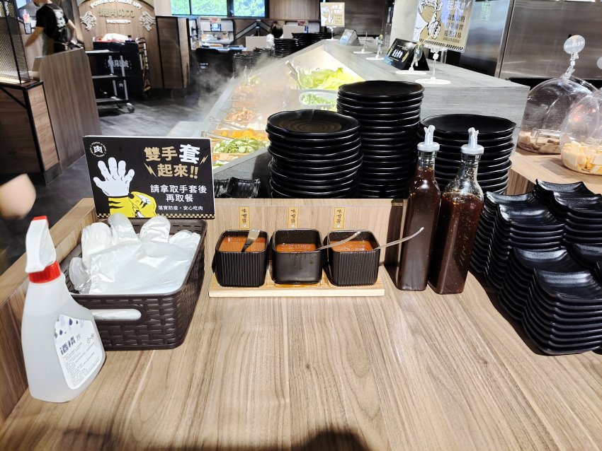 ▼這裡也有提供免洗手套、酒精,大家離開座位記得配戴口罩、戴免洗手套夾取餐點,疫情期間用餐起來也更加安心!一旁也有提供味噌醬、蒜味醬油膏,也可以搭配生菜、燒肉享用!