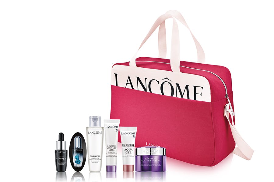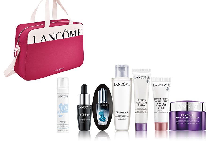 於蘭蔻專櫃購買正產品滿NTD 13,900﹝需內含 NTD 4,700 正產品﹞即贈 「超緊顏修護旅行組」、「法式旅行袋」。
