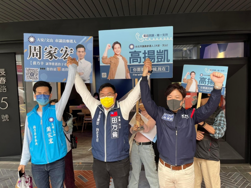 底大選,各黨派市議員擬參人為爭取曝光,各出奇招。其中找來大咖、名人加持總被視為上策,國民黨籍曾獻瑩,宣布參選大安文山市議員,就找來前台北市長郝龍斌、中廣董事長趙少康等人到場陪同,名人、大佬光環加好加滿,無奈媒體焦點全落在羅智強跟黨中央的桃園市長初選爭議。反觀同黨擬參選人高揚凱、田方倫、周家宏,三位國民黨青年軍,登記後手拉著手,宣示即便是競爭關係也能靠團結、憑本事拿下勝利。