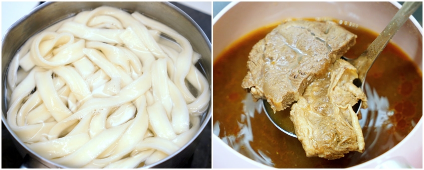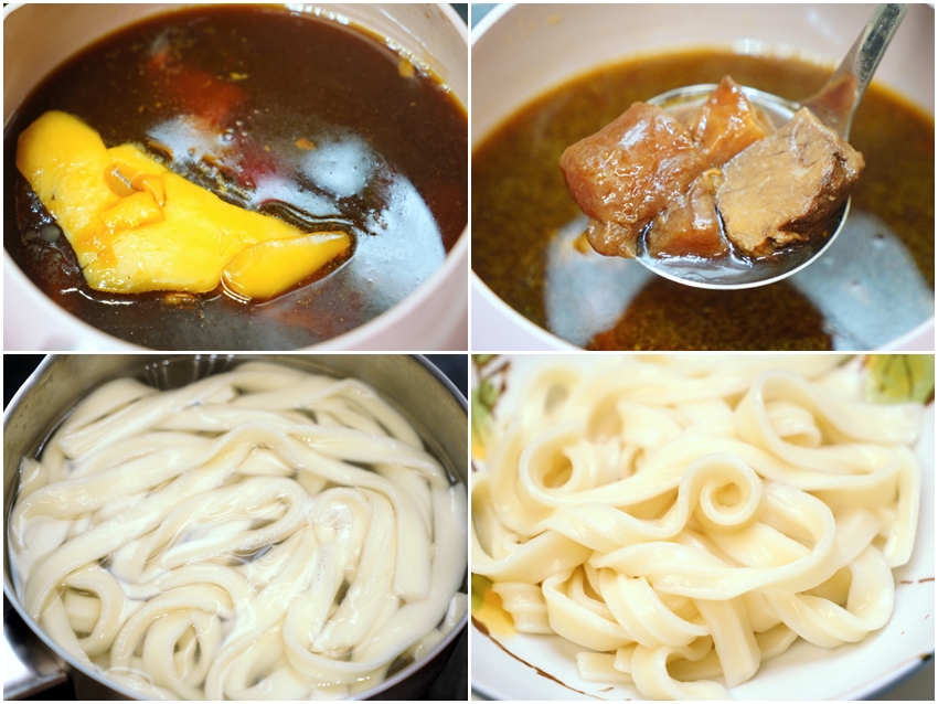 ▼「台北萬豪酒店 半筋半肉牛肉麵」附的麵條是手工刀削麵,煮熟後即可撈起備用;牛肉湯包裡頭有大大一塊的牛油,將湯頭加熱至沸騰後即可加入麵條享用~