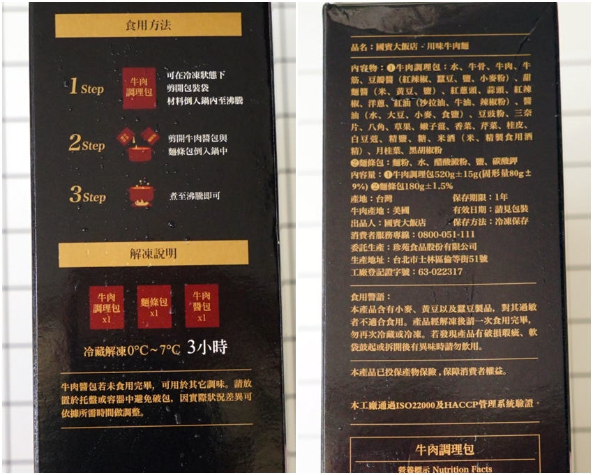 ▼「台北國賓大飯店 國賓五星川味牛肉麵」採用冷凍保存,盒側也有詳細的產品說明與覆熱方式~~