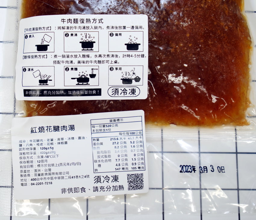 ▼「混董創食 紅燒花腱牛肉麵」採用的是牛肉湯、麵條分開包裝,都是需要冷凍保存,包裝外頭也有詳細的覆熱方式與產品說明!
