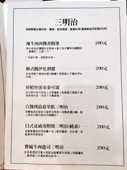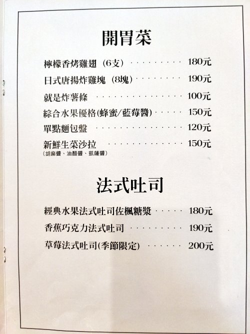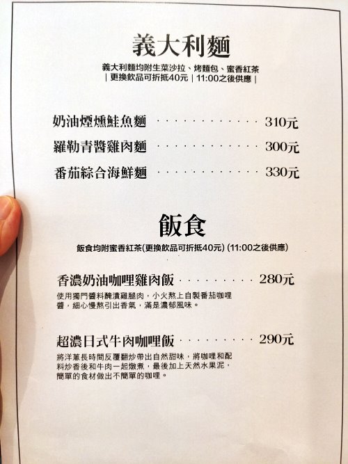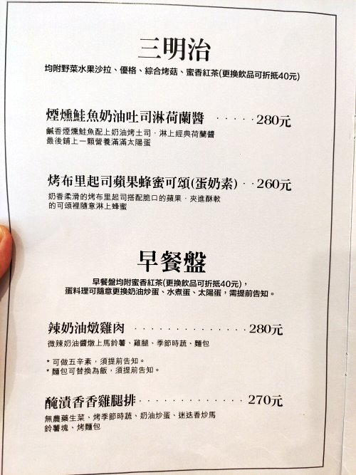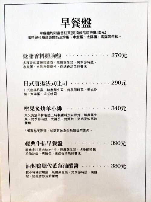▼這裡的餐點有三明治、早餐盤、義大利麵、飯食、開胃菜、法式吐司、花果茶飲、氣泡飲、咖啡、其他飲品等,選擇還不少~~我們這次就是想來吃個早午餐,所以都點了早餐盤!因為內外場只有各一人,餐點又是現點現做,所以大家可要耐心等候啊~~