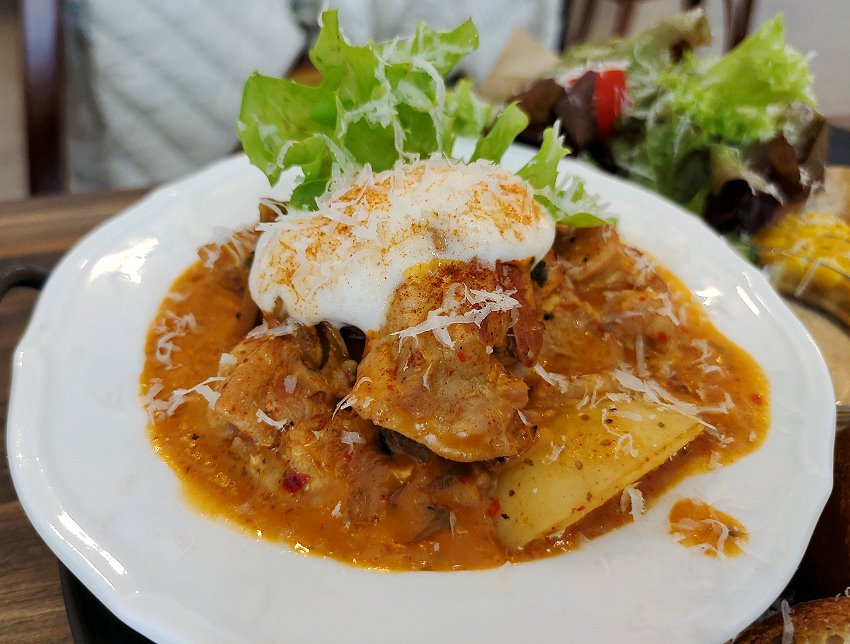 ▼無辣不歡的朋友看到這道辣奶油燉雞肉立刻點來試試,這份採用鐵鍋上桌,看起來比剛剛那份醃漬雞腿排更大一盤,感覺就很超值!內容物也不少,採用微辣奶油醬搭配馬鈴薯、雞腿一起燉煮,一旁還有附上季節時蔬、奶油炒蛋、麵包(可替換為飯,需提早告知),吃完也是挺有飽足感的!