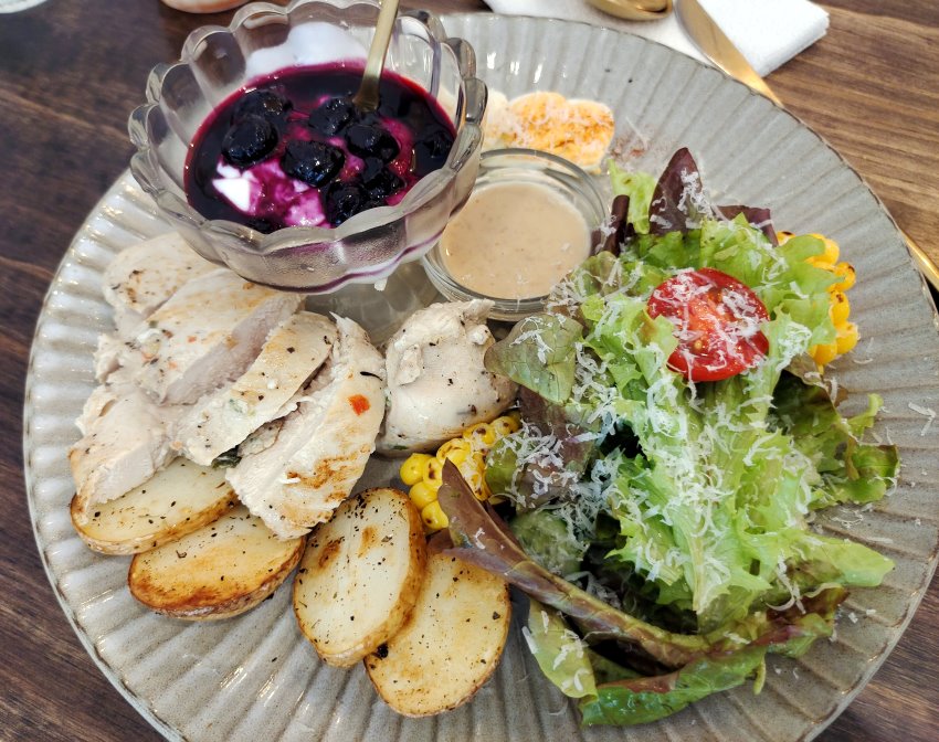 ▼這份低脂香料雞胸盤也是健身、減脂朋友的最愛,採用多種香料葉下去醃漬雞胸,搭配無農藥生菜、烤季節時蔬、水煮蛋、自製果醬優格、迷迭香炒馬鈴薯塊,吃起來飽足又無負擔!雞胸肉給得紮實又大塊,吃起來挺有飽足感~~蛋料理都可換成奶油炒蛋、水煮蛋、太陽蛋,不過也是要提前告知!