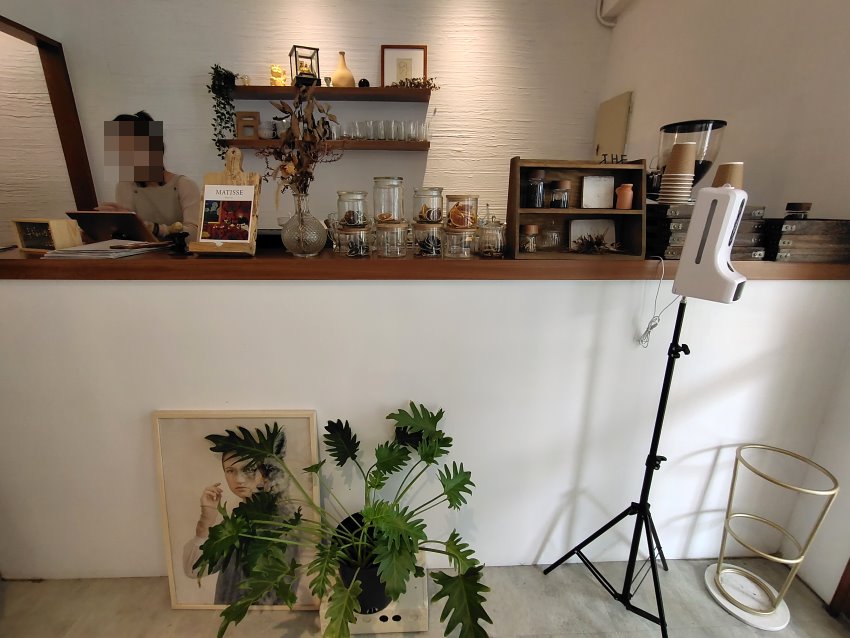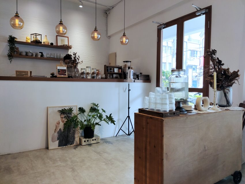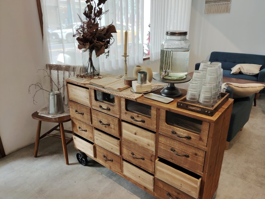 ▼一進門的左側就會看到這個充滿特色、帶點斑駁感的小櫃子,上頭放有開水、餐巾紙、餐具等,有需要的朋友都可以來自取!