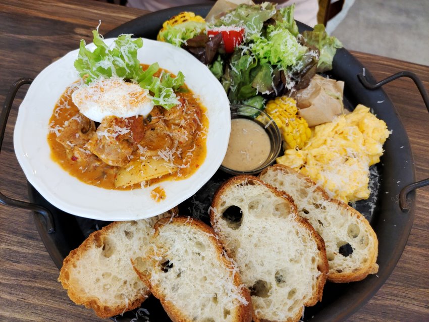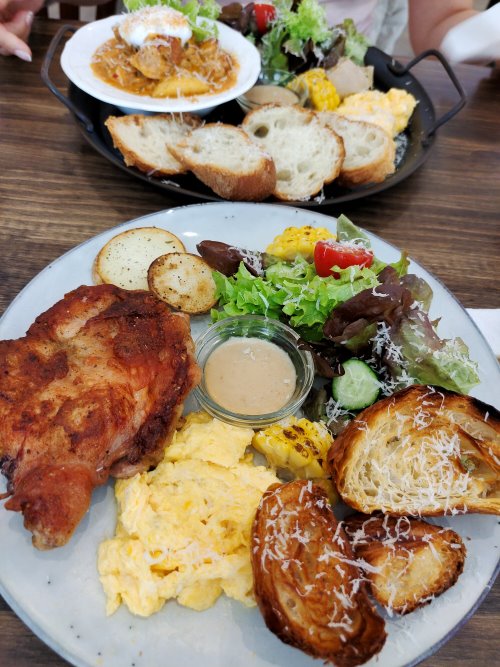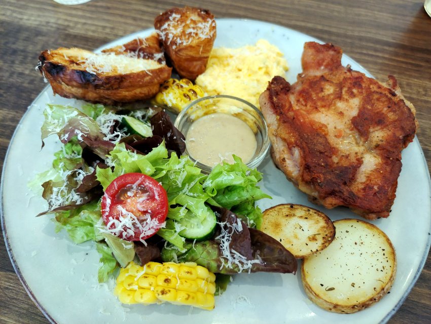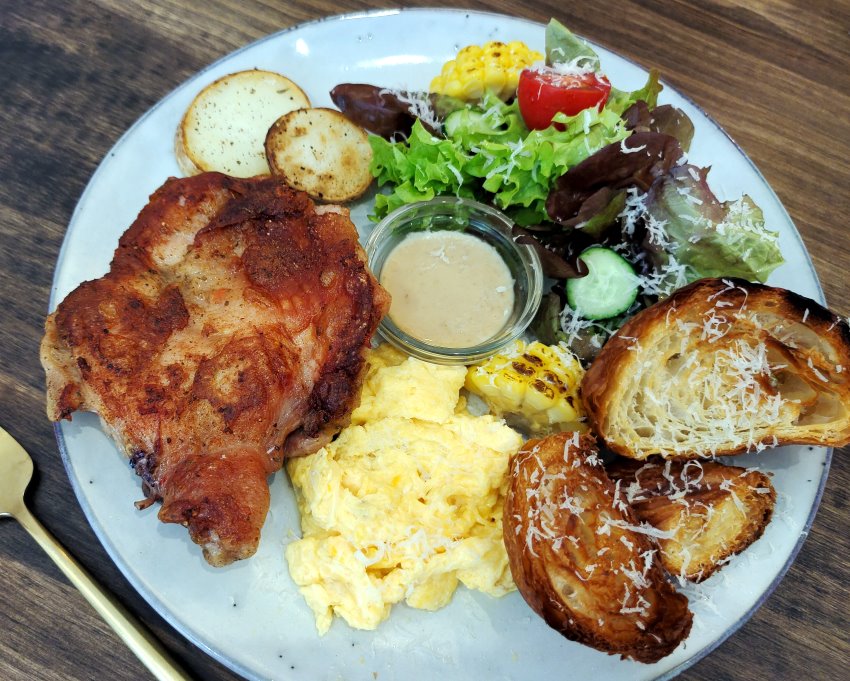 ▼生菜搭配胡麻醬吃起來提味又清爽,一旁還有搭配烤過的玉米,蔬菜種類還不少!奶油炒蛋,吃起來還算香嫩,搭配著吃也不會有太大負擔~~烤麵包仔細一看竟然是切片的可頌,經過香烤後吃起來更加香酥多層次,還挺不錯吃的!醃漬雞腿排外皮酥脆、肉質鮮嫩,帶有香料的香氣,吃起來鹹香夠味,但吃久了有點偏鹹就是,搭配嫩蛋、生菜、馬鈴薯享用比較剛好!