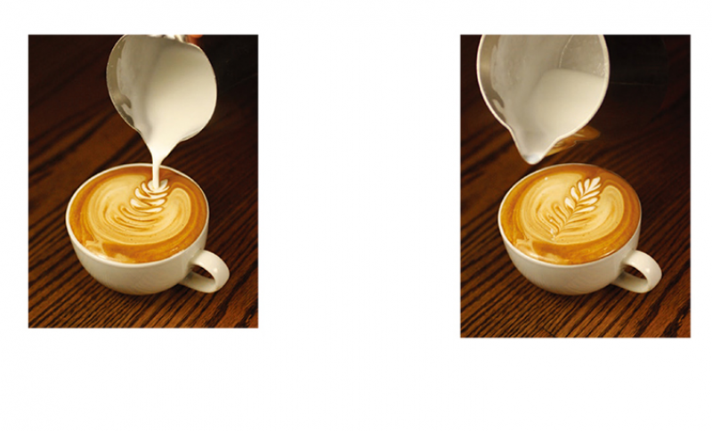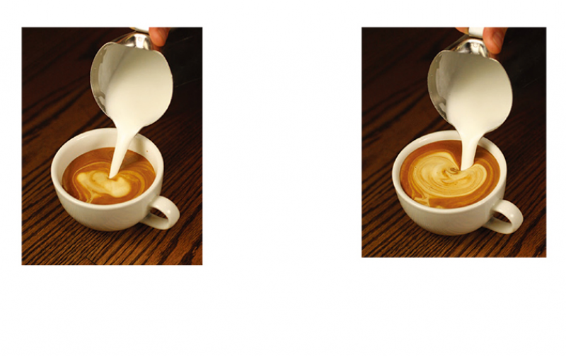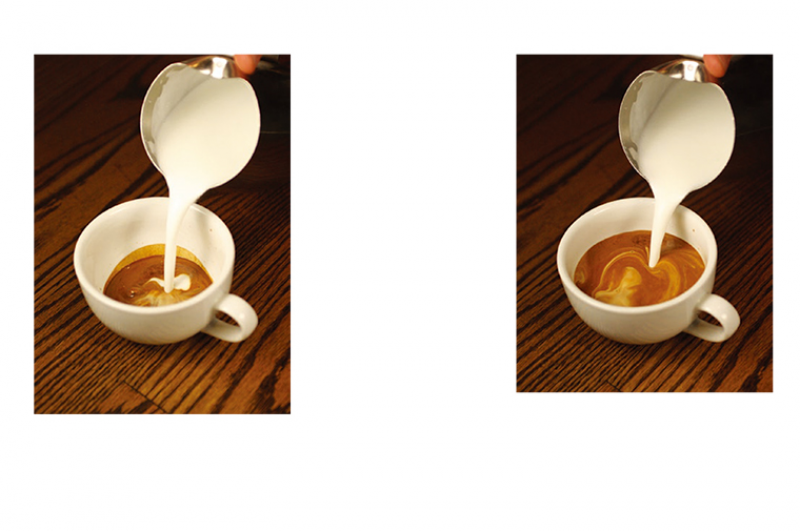 注入牛奶時若將奶鋼往上提、離開飲品表面,會使得牛奶無法被輕輕「放在」克立瑪上,且會因重力而加速。注入牛奶時拉高奶鋼,就像是從高高的跳水臺一躍潛入深水:跳水選手能直接切穿水面,幾乎不帶任何漣漪地潛入深水。同樣的道理,奶鋼中的牛奶也會直接潛入杯底,難以擾動克立瑪。反之,注入牛奶時如果將壺嘴非常靠近飲品表面,就像是站在泳池邊準備跳入水中競速的選手:選手拂掠過水面而進入水中的模樣,就如同牛奶滑過飲品表面並創造美麗的痕跡。
