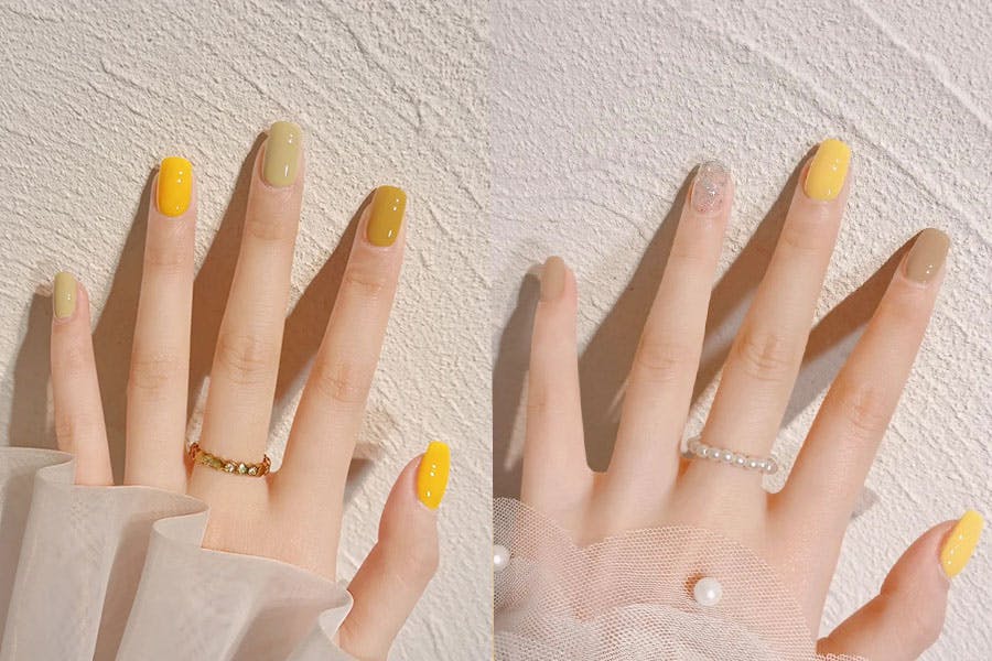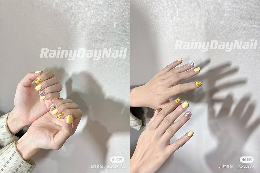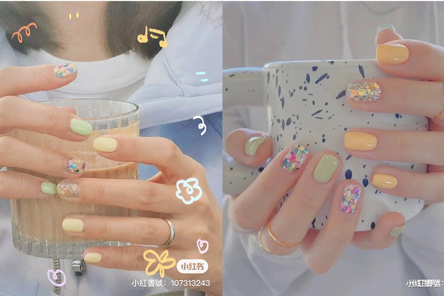 選擇兩種飽和度低的色系奶黃色跟牛油果綠,加上滿滿的亮片,除了能打造出不同款式趣味感,截然不同的跳色款也能帶來視覺的雙重享受,讓雙手多了活潑感,搭配衣服也有了更多選擇。