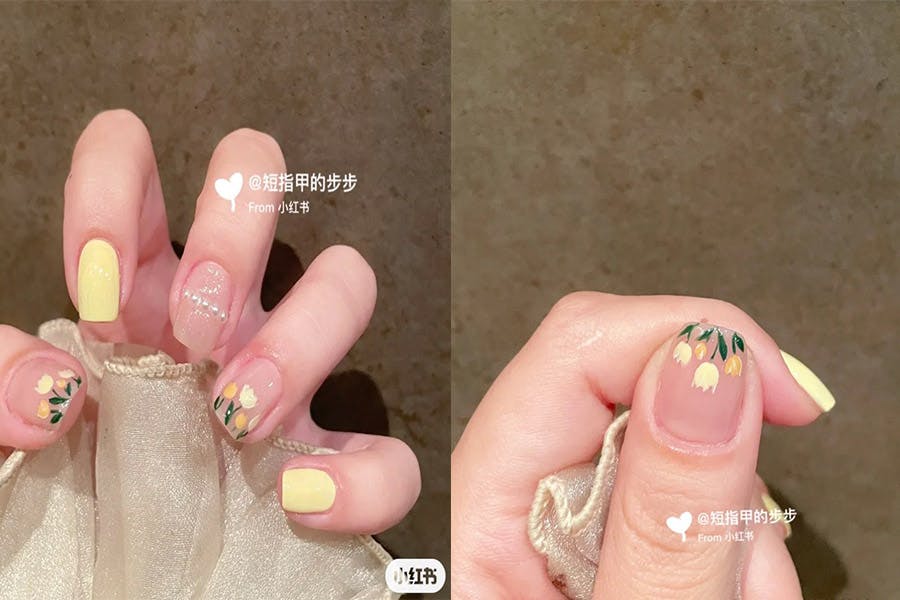 手繪的鬱金香適合喜歡短指甲的小姐姐,奶呼呼的黃色當主調加上珍珠點綴,搭配上初夏花季的鬱金香,讓手指跟著花季一起綻放吧!