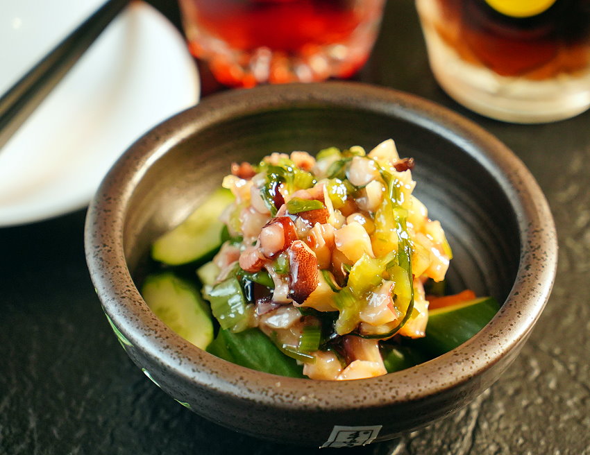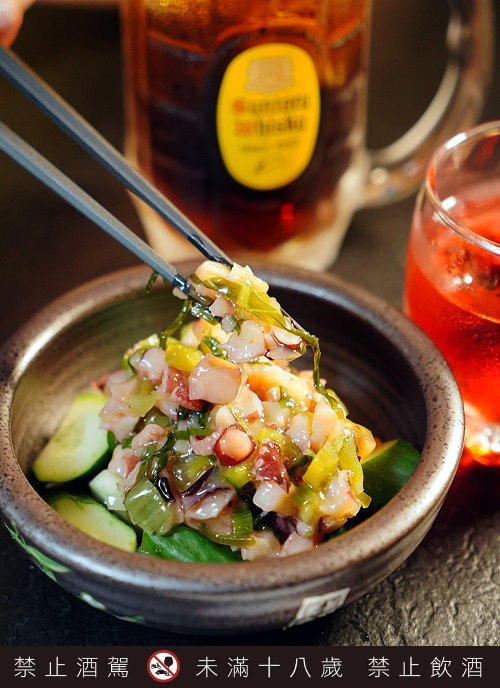 ▼芥末小章魚,採用剁碎的小章魚搭配酸黃瓜、海帶芽等配料加上特調醬料下去拌成,下方再鋪上小黃瓜增添清爽口感!