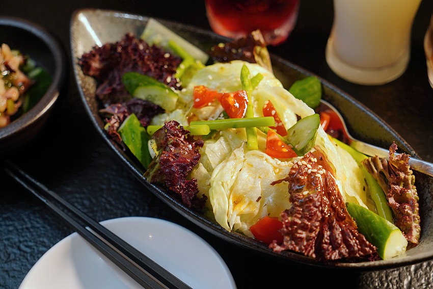 ▼和風生菜沙拉,裡頭有多種生菜、蘆筍、小黃瓜、番茄丁等配料,淋上清爽的特調和風醬料,吃起來酸香甘醇又帶點微微辛香氣息,爽口又開胃!