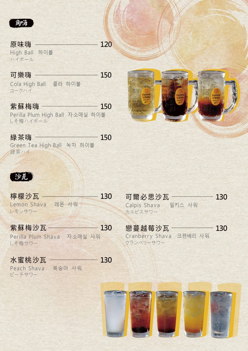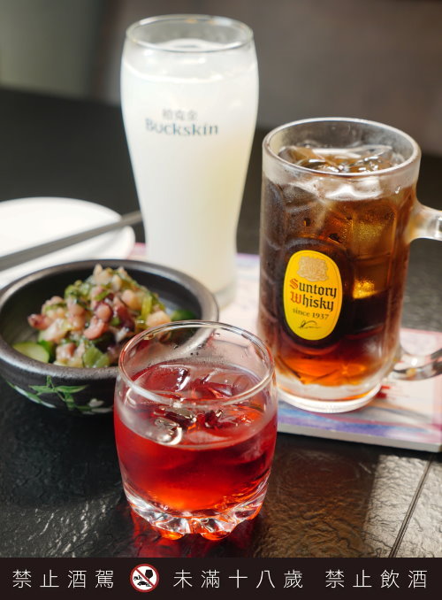 ▼來到這裡怎麼可以不來杯酒!!我們點了鍛高譚紅紫蘇梅酒、可樂嗨、可爾必思及芥末小章魚來下酒~~紅紫蘇梅酒採用萃取紅紫蘇汁液,酒色看起來就跟紅寶石一樣耀眼奪目,喝起來帶有濃郁的紫蘇香氣,酸香甜美又帶有醇厚的果實香氣,不管搭餐或單飲都很適合;可樂嗨,也就是角嗨的一種,將角瓶威士忌加入碳酸飲料變成全新的調飲,推出後就受到日本年輕人的喜愛,也是居酒屋最受歡迎的飲品之一,喝起來帶點威士忌的麥香滋味,加上氣泡清爽口感,酒感並不重,搭配餐點去油又解膩!(未滿十八歲請勿飲酒)