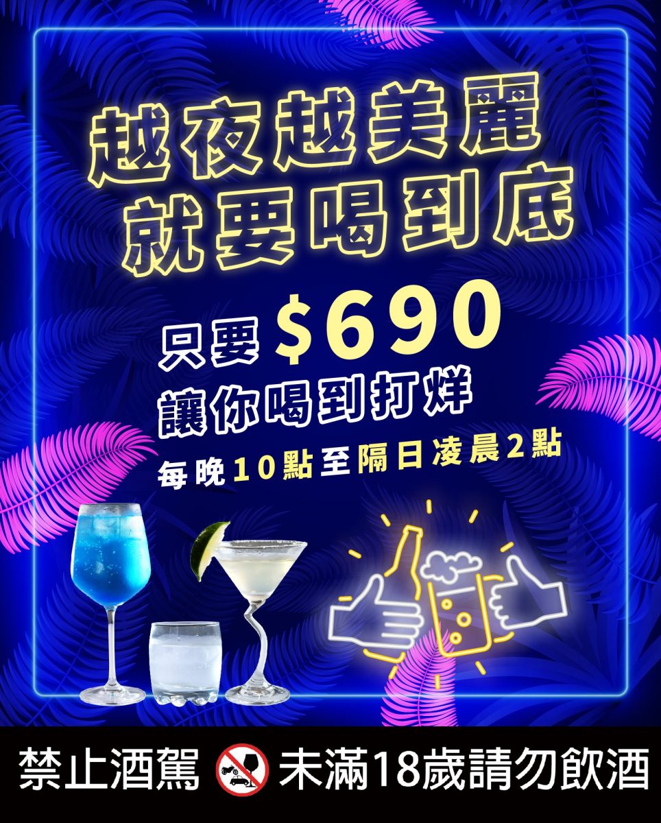 ▼此外還有推出晚場進階版的「越夜越美麗、就要喝到底」活動,從10點喝到凌晨2點打烊每人只要690元,真的很超值啊~~(未滿十八歲請勿飲酒)