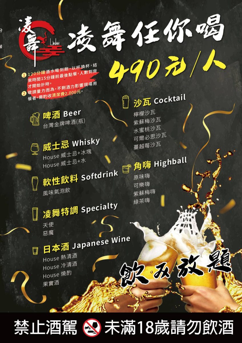▼凌舞居酒屋還有推出「凌舞任你喝」活動,多款酒精類飲品通通任君挑選,限時120分鐘每人只要490元,不管是喜愛小酌或是喝酒新手都能愉快的找到自己喜愛的酒類~~(未滿十八歲請勿飲酒)