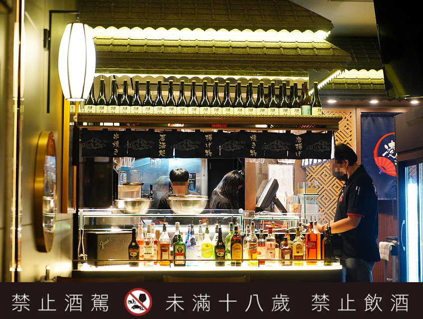 ▼櫃台特別以日本屋瓦搭配多款酒類、掛布營造出屋台風情,突然好想坐下來喝一杯!(未滿十八歲請勿飲酒)