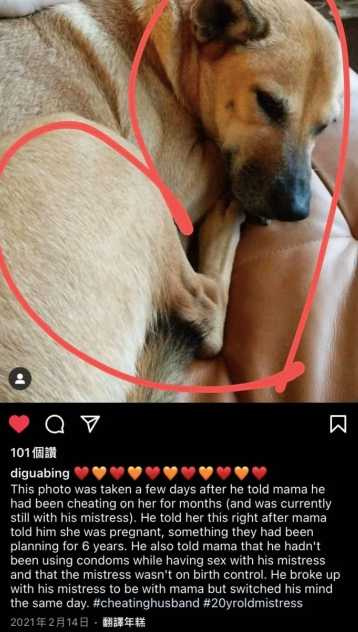 Leo王愛犬IG的多篇文章內文,都被改成英文的控訴,內容提到Leo王外遇數個月,太太告知Leo王自己懷孕後,Leo王就坦承有了小三,還提到與小三發生關係都沒有用保險套,也曾為了跟老婆再一起與小三分手,沒想到在當天就改變了主意,引人注意的是文末還特別強調「欺騙人的老公」與「20歲小三」,令人震驚。對此,顏社發出回應,提到:「我們還在確認中,有進一步的消息再回覆。」