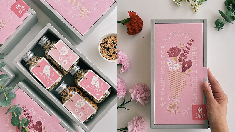 「愛在穀子裡」多穀母親節禮盒除了獨具巧思的多穀物組合,更在包裝上運用花語大聲向媽咪示愛,每罐穀物瓶身都設計有專屬花語吊牌,康乃馨,母親之花,傳達子女對媽咪的思念;魯冰花,代表著母親不計回報的愛;海芋代表母親純淨之愛;瑪格麗特,象徵女權之花,代表母親對子女喜悅、滿意之情。將子女對媽咪的愛與感謝完整傳達在禮盒中,真正是送禮送到心坎裡。