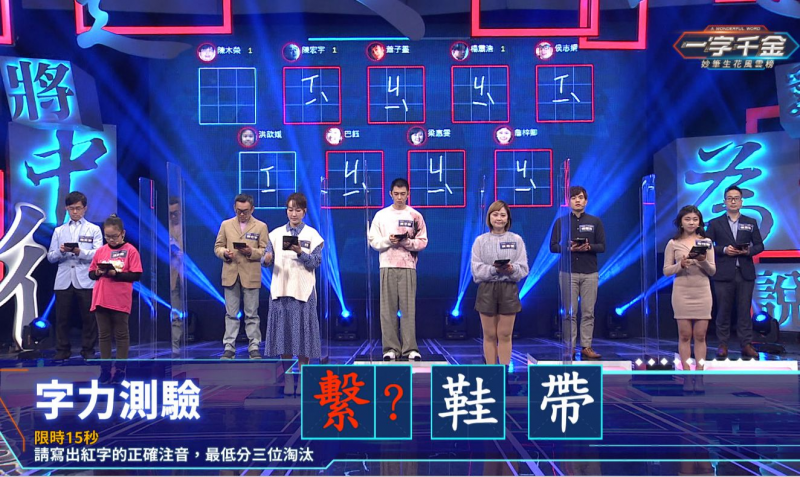 他們八位依序比拼『字力測驗』、『字裡乾坤』、『東拼西湊』及『洞築機先』四個關卡,採淘汰制。