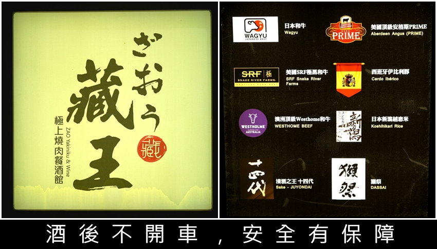 ▼門口列有店內採用的食材,不管是日本和牛、美國頂級安格斯Prime牛肉、美國SRF極黑和牛、西班牙伊比利豬、澳洲頂級和牛等頂級肉品在這裡通通都能一次滿足,搭配日本新潟越息米及清酒之王十四代、獺祭等,讓人可以享受大口吃肉、大口喝酒的快感!(未滿十八歲請勿飲酒)