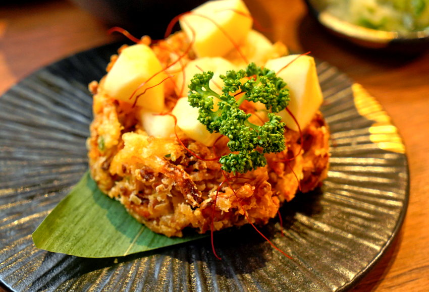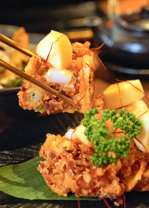 ▼天婦羅吃起來外皮香酥甘甜,裡頭包裹多種蔬菜、蝦仁、花枝等配料,吃起來層次多元又美味,我們自行搭配剛剛的明太子美乃滋醬也很合拍!