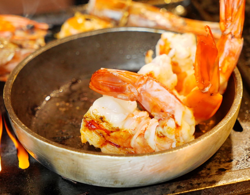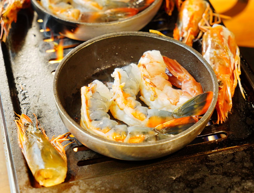 ▼只見粗壯的大蝦在鑄鐵鍋中排排站好,光看燒烤過程就覺得很誘人啊~~
