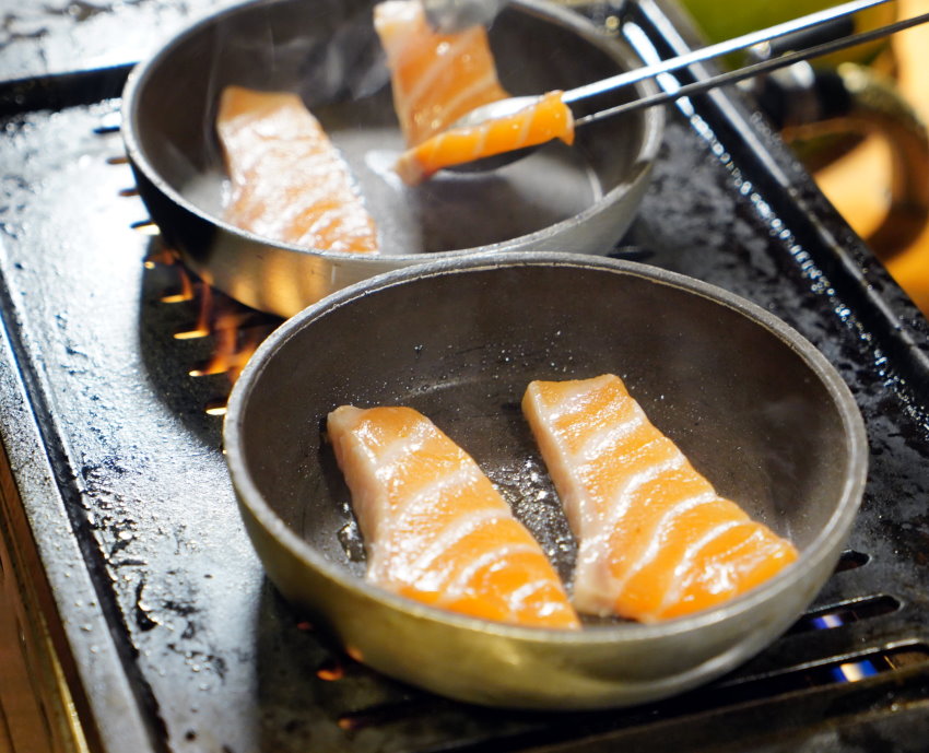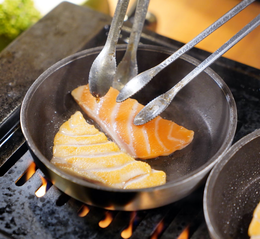 ▼烤海鮮還會先換成鑄鐵鍋再下去燒烤,受熱均勻也更能鎖住海鮮的鮮甜美味~~因為鮭魚是生食等級的,不想吃太熟或想直接生吃的朋友也可以告知服務人員唷!