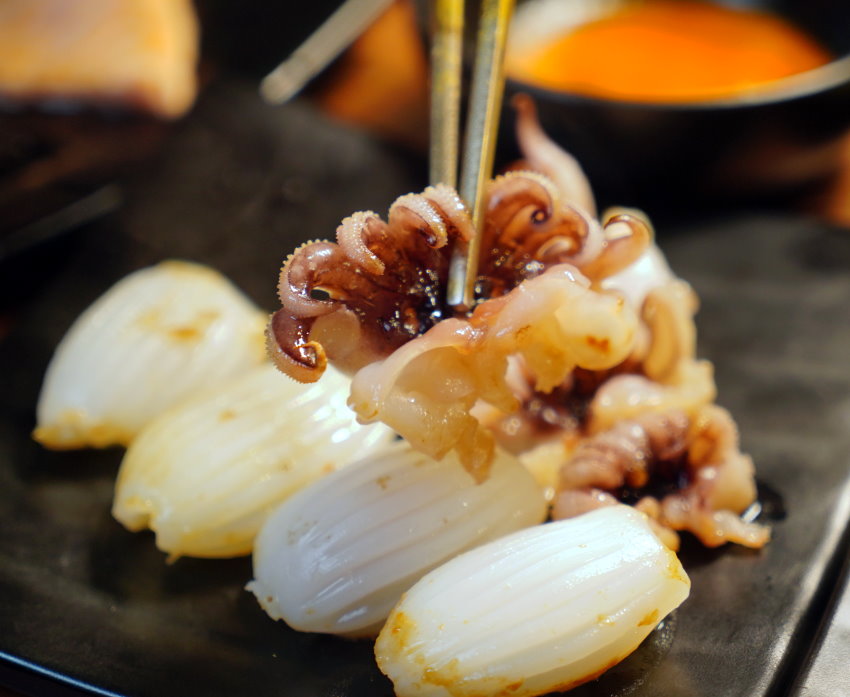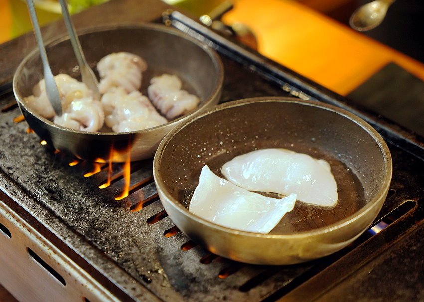 ▼花枝也是生食等級,其中一鍋烤身體的部份,另外一鍋則是觸角,燒烤過程中會看見花枝慢慢捲曲起來~~也挺療癒的!