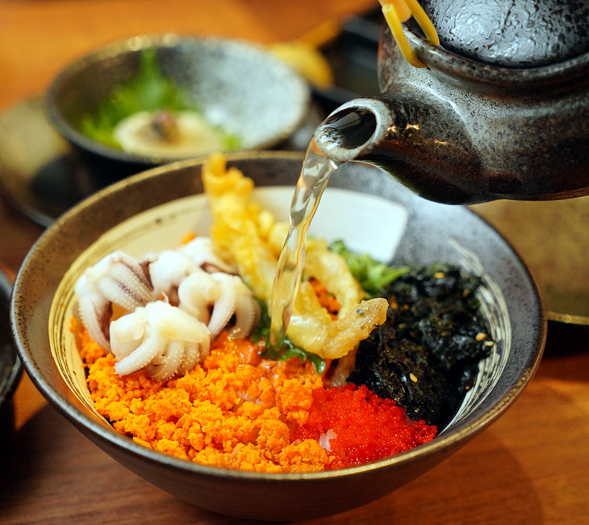 ▼築地海鮮湯飯,白飯上頭鋪了鮭魚鬆、花枝、魚卵、炸銀魚、海苔、蔥花等配料,一旁附有牛肉清湯,大家可以自行加入享用,也就是典型的日式茶泡飯吃法!