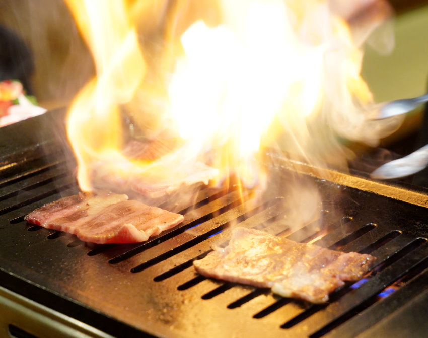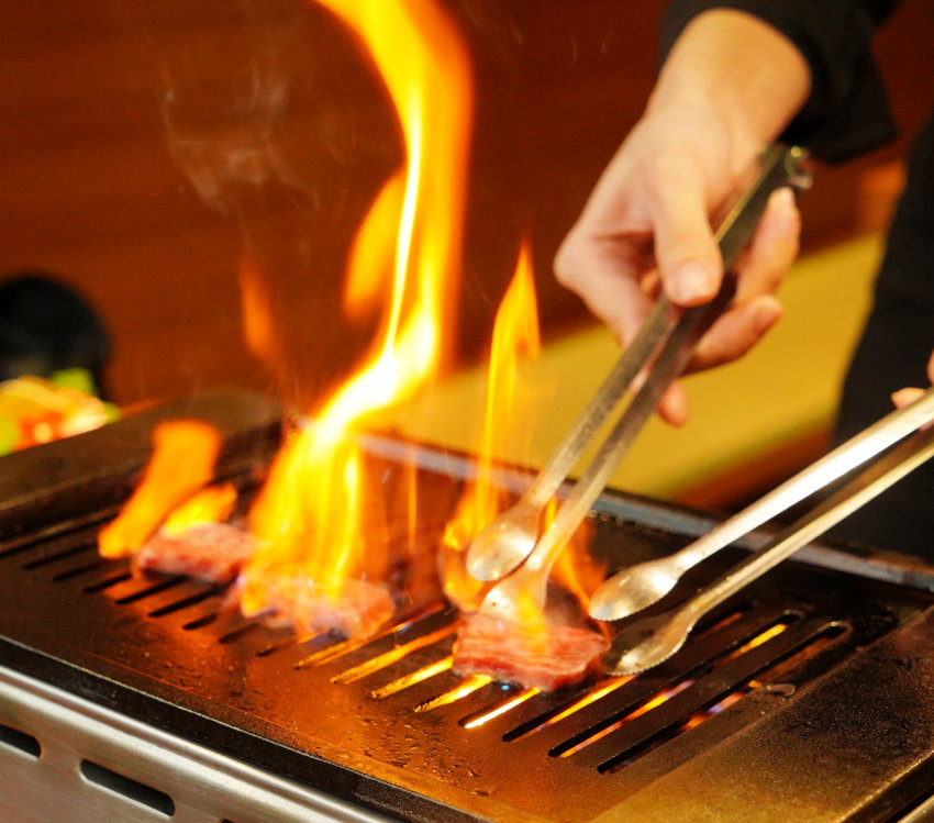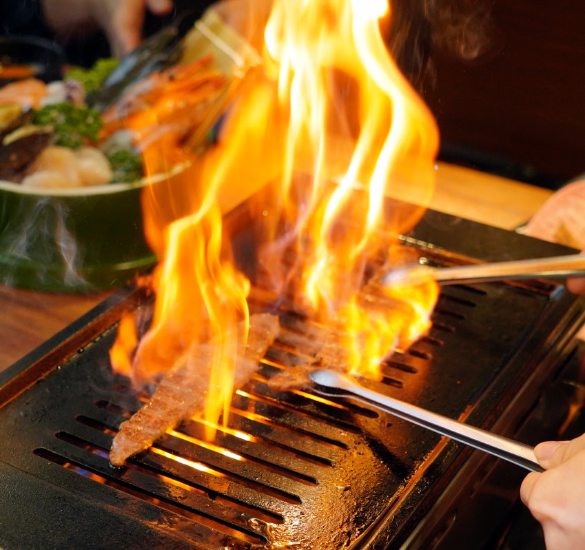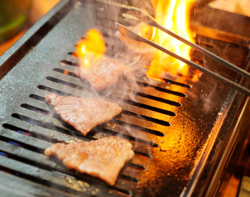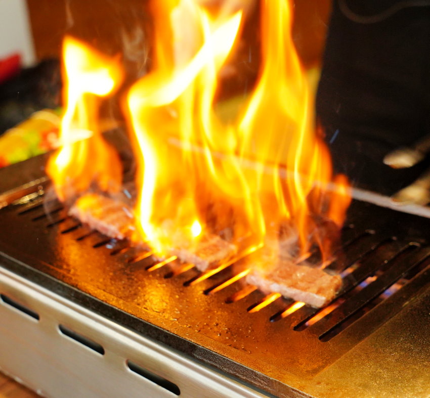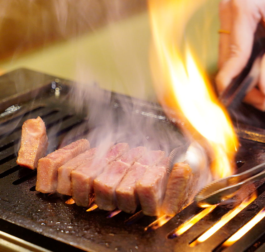 ▼接下來要開始享用美味的燒肉啦~~這裡都是由服務人員幫忙代烤,大家就不用擔心會聊到忘我不小心讓嬌貴的肉片糙灰搭啦!!燒烤順序是由咀嚼少到咀嚼多的肉品,但就我們一路吃下來幾乎都很好咬XD只有分為非常好咬、很好咬跟好咬這三種程度,哈!這裡採用的是鑄鐵烤盤,只見肉片在火光中跳著舞,沒兩下就能起鍋享用啦~~