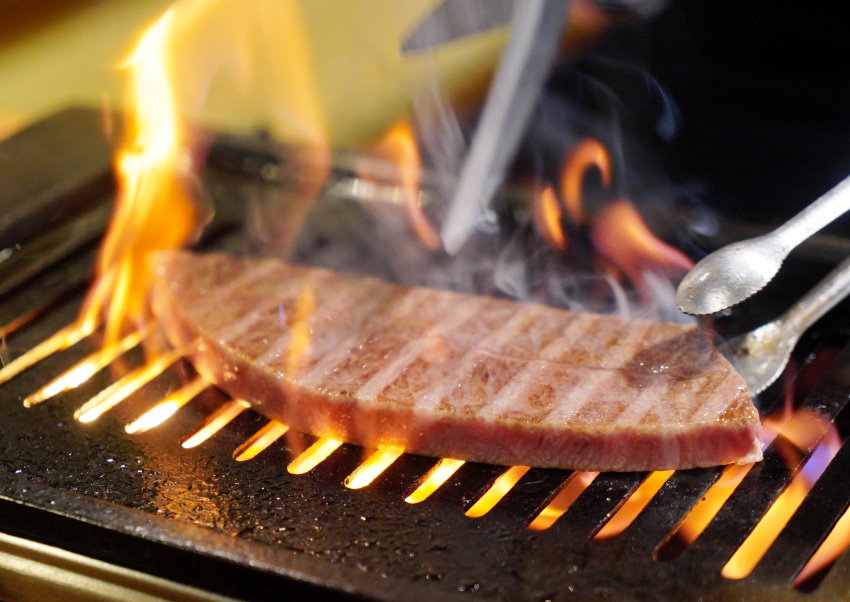 ▼肩胛小菲力,只見肉片在煙霧與火光中打滾著,不一會兒就能吃到它的美味啦!