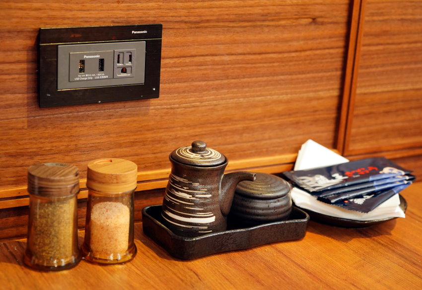 ▼每桌都有設置插座,就不用擔心手機快沒電會吃得很焦慮,整個很大心啊~~桌上也有提供黑胡椒、玫瑰鹽、日式醬油、七味粉、衛生紙、濕紙巾等,有需要的朋友都可以自取使用!