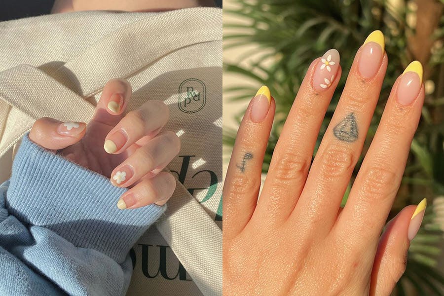 手部肌膚偏黑或膚色不均,覺得上白色不夠好看,或是怎樣都不習慣純白色,推薦相對不挑膚色的奶黃色美甲,搭配小雛菊等黃花造型都可以顯得活潑、可愛。