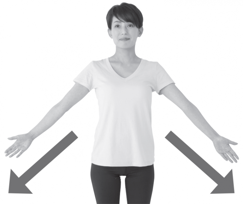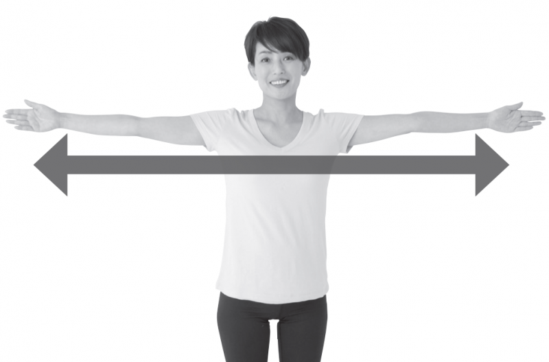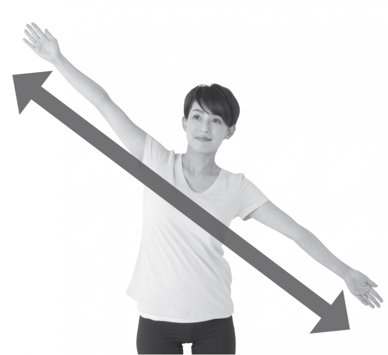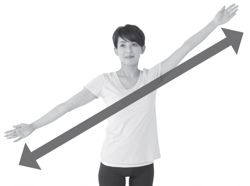 基本上,在不感到疼痛的範圍內,先將兩手往左右舉高,接著形成斜對角線,盡量向左右上下伸展,想像要將手拉離身體中央一樣。