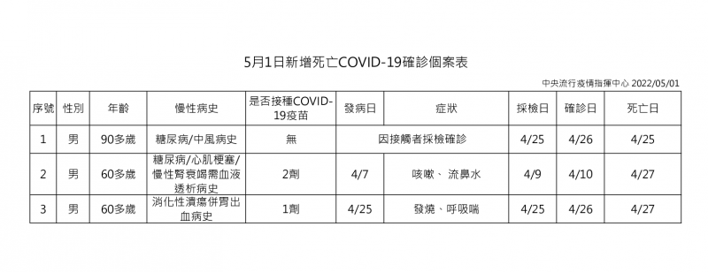指揮中心指出,今日新增3例本土病例死亡個案,均為男性,年齡介於60多歲至90歲以上,皆屬重度感染個案與具慢性病史。確診日介於4月10日至4月26日,死亡日期介於4月25日及4月27日