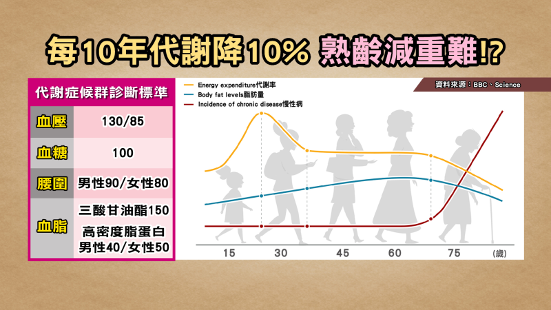 ▲ 正常人代謝率每增加10歲就降低10% 熟齡減重更不易。(圖:TVBS)