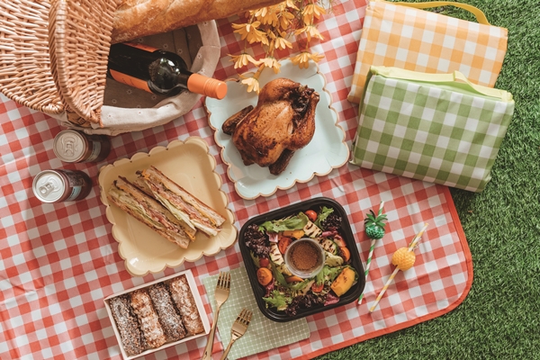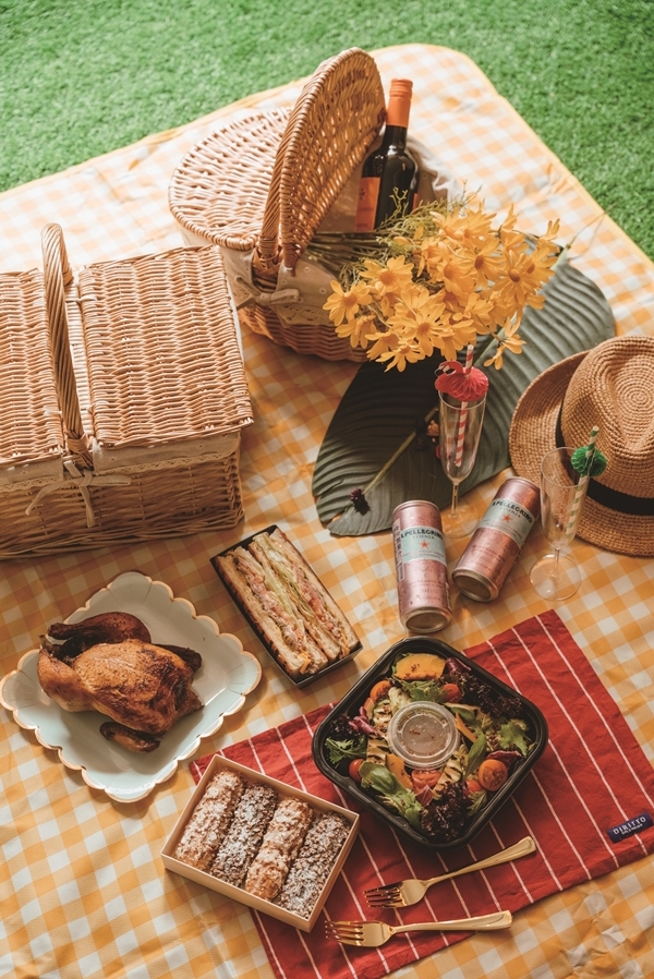 總共提供二個野餐籃,一個盛裝各式鹹甜美味餐點,計有清爽開胃的「和風田園沙拉」,酥脆法國麵包抹上芥末美乃滋與酸黃瓜碎,再夾入烤至粉紅軟嫩的爐烤肋眼牛,層疊上融化起司、番茄與美生菜增添口感的「爐烤美國肋眼牛肉三明治」,The Deli熱賣冠軍、皮酥肉嫩的「泰式烤全雞」搭配特製酸辣醬汁最對味。