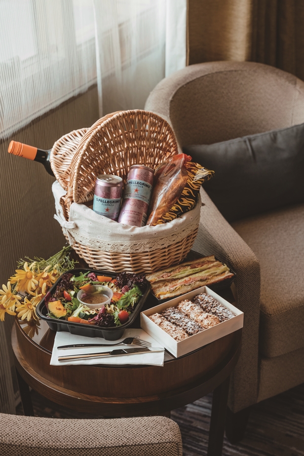 飲品也很講究,附有歐美名人最愛的「義大利聖沛黎洛天然氣泡水果飲」兩罐,自家果園採摘的鮮果汁,香檳般的細膩氣泡及酸甜滋味讓酷夏清爽起來,以及帶有甜美櫻桃果香、入喉柔滑的「精選法國紅酒」乙瓶,愜意度過微醺午後。另一個野餐籃內裝有美拍道具,新手懶人適用,飯店準備了高腳酒杯,可愛的紅鶴、鳳梨、椰樹吸管,兩套粉嫩餐具,並免費提供藤編野餐籃、拍照花束出借服務,專案再贈專屬風格野餐墊可以帶回家(隨機贈送不挑色),一應俱全的服務讓旅客輕鬆享受春日行。