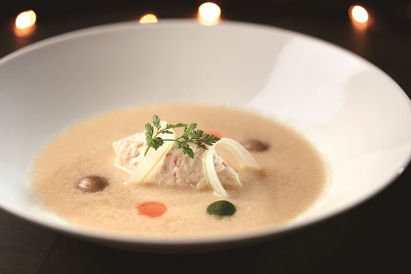 羅馬傳統最具代表的「羅馬式乳酪蛋蓉雞湯」,湯底為雞高湯,將雞蛋及帕瑪森起司粉快速打散加入,改良作法將雞肉打成泥狀慕斯,入口更加綿密,再以季節時蔬提升鮮味,滑嫩蛋蓉加上起司香氣,好溫柔的滋味。經典羅馬料理「培根蛋黃義大利麵」醬汁的熱前菜「香煎鯛魚菲力及龍蝦鉗佐奶油培根醬汁」,以洋蔥、培根、白酒、蔬菜高湯加入鮮奶油特製佐醬,搭配香煎鯛魚菲力和鮮美龍蝦鉗,再點綴鮭魚卵更增添豐富大海滋味。