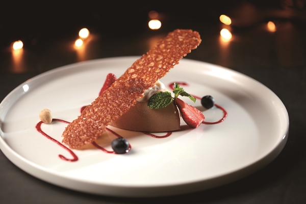 最後以甜點「義式牛奶巧克力莓果雪糕」做完美結尾,特製內餡酸爽莓果凍,外層半冷凍的義式牛奶巧克力雪糕,海鹽巧克力酥於底部襯綴,搭配清爽微酸的新鮮草莓、藍莓平衡甜味,飾以整顆榛果及焦糖脆片,底層淋上覆盆莓醬汁,多層次酸甜滋味,每一口都是驚豔。