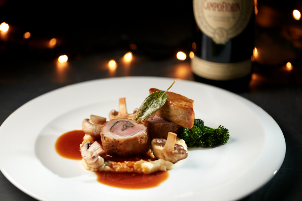 主菜推薦「不一樣〝跳進嘴裡〞的羅馬犢牛肉捲」,改良自義大利經典料理「跳進嘴裡」,將小牛肉、鼠尾草及帕瑪火腿以肉捲方式呈現,佐搭富有香料風味及焦糖甜味的馬德拉紅酒醬汁,再加入口感濃郁的鴨肝、青花菜、玉米蓉,口感層次豐富。