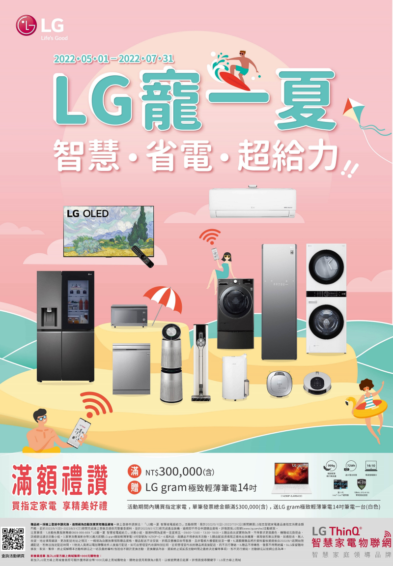 時序即將進入炎炎夏日,加上近日疫情升溫讓人不想踏出家門,LG致力為消費者創造美好健康的居家生活,特別集結冷氣、冰箱、洗衣機及空氣清淨機等夏天必備產品,推出「LG寵一夏 智慧‧省電‧超給力」優惠活動,即日起至07/31期間購買指定家電並完成贈品兌換登錄,即可享NeoChefTM 智慧變頻微波爐、LG x Finish潔淨光亮套組禮盒等多項精美好禮,不論是想犒賞自己或是還沒買禮物寵愛媽咪的各位都能趁現在趕快入手。活動期間購買指定家電,單筆消費總金額滿30萬元,上網登錄審核通過即送註114吋LG gram極致輕薄筆電一台(白色)!