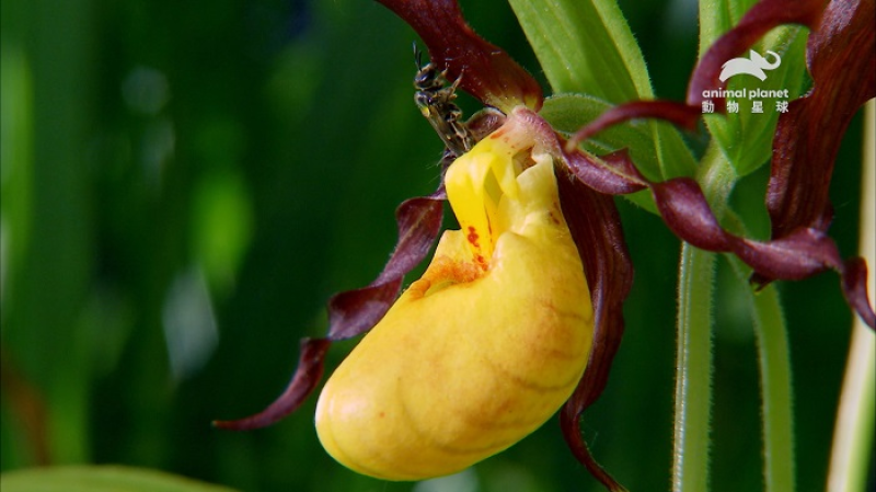 ▲ 蜜蜂掉入仙履蘭唇瓣裡,掙脫時花粉會沾黏身上。(Discovery電視網)